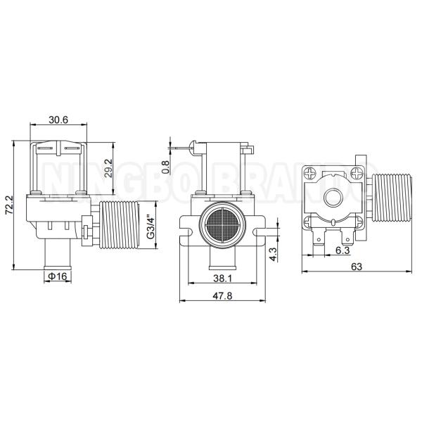This water inlet solenoid valve is popularly used in washing machine, dishwasher, ice maker, etc; G3/4'' male threaded inlet, 16mm barb outer diameter outlet, PP body, EPDM seal, 0.2 to 10 bar working pressure, 2 way normally closed, diaphragm pilot operated, various voltages for selection, 12VDC, 24VDC, 24VAC, 110VAC or 220VAC, other voltages can be customized.
